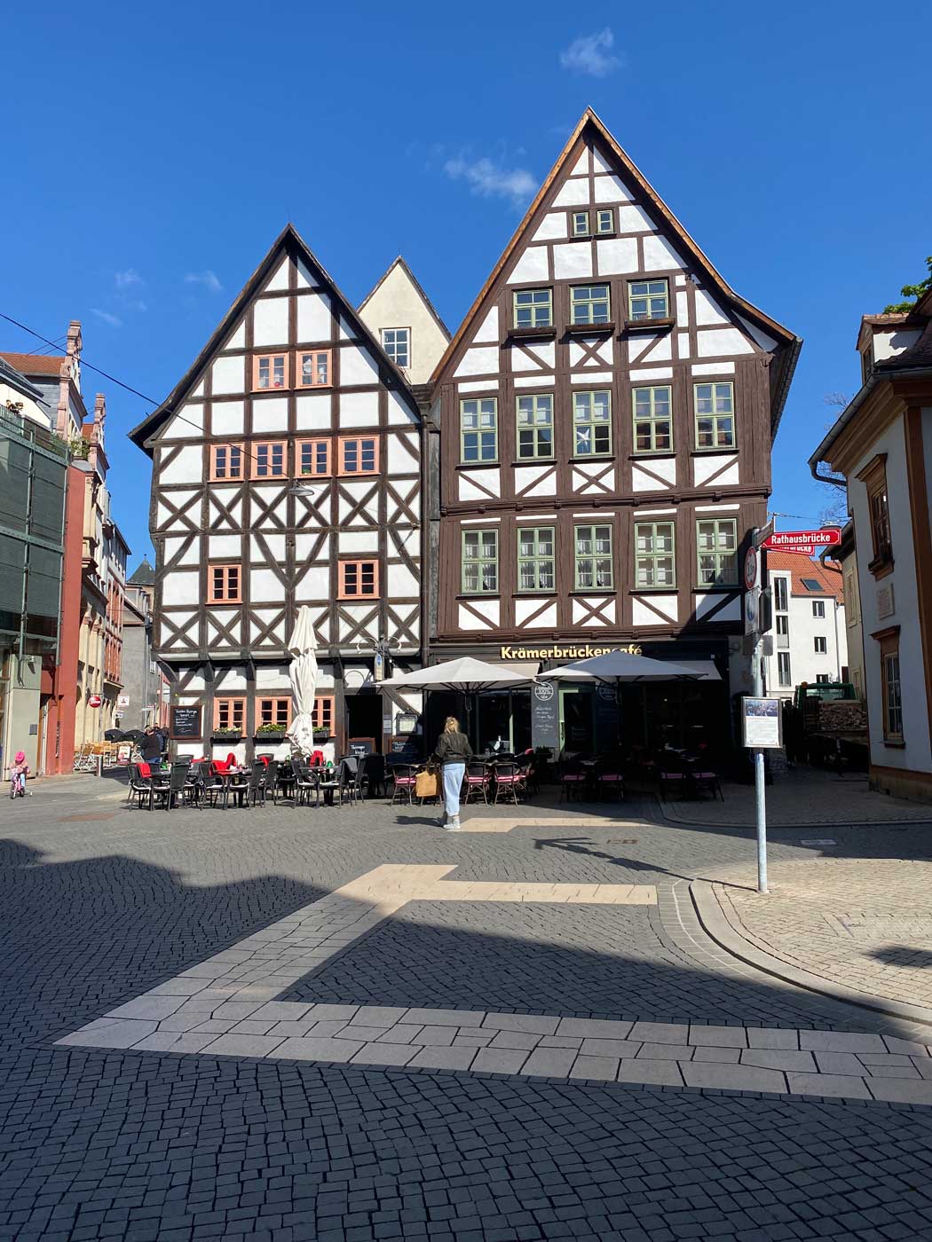 Een van de bezienswaardigheden van Erfurt is de Krämerbrücke. Dit is de langste doorlopend met huizen bebouwde en bewoonde brug in geheel Europa. De burg heeft een lengte van 120 meter en was oorspronkelijk bebouwd met 62 smalle huizen die later tot 32 huizen zijn samengevoegd. Tegenwoordig bevinden zich op deze plek allerlei kleine winkeltjes. Later in dit reisverslag volgt nog een foto waarop de brug beter te zien is.