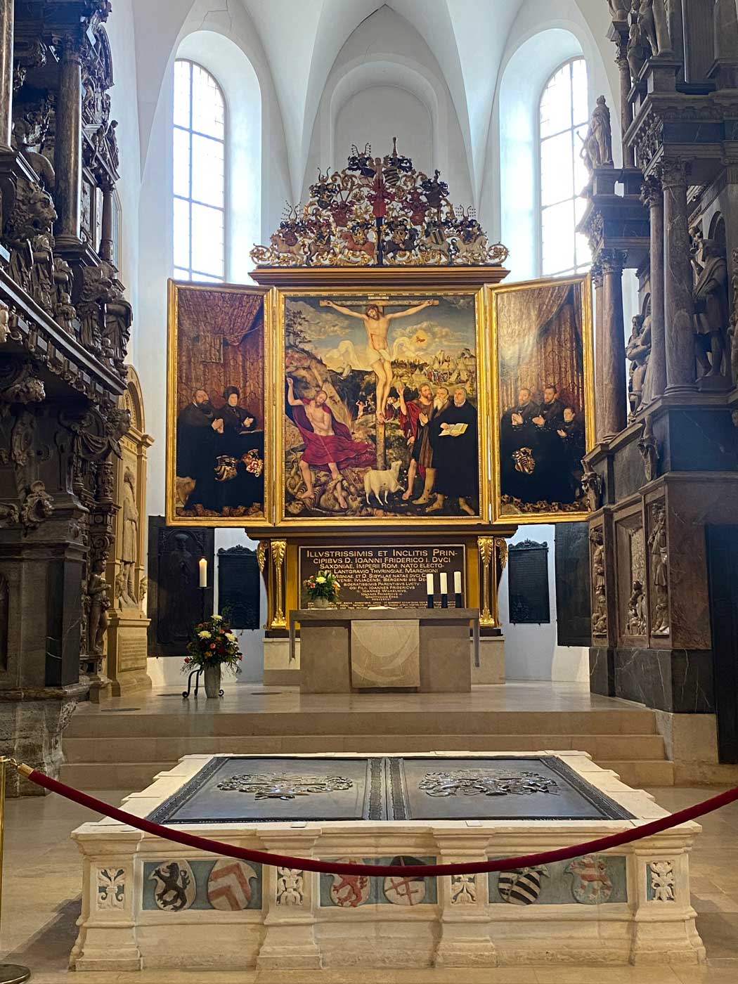 Het altaar van de kerk is in het jaar 1555 gemaakt door Lucas Cranach junior. Het altaar laat door middel van een aantal schilderijen de leer van Martin Luther zien. Op het linker paneel van het altaar zijn hertog Johann Friedrich en zijn vrouw te zien. Ze zijn knielend in gebed afgebeeld. Rechts staan de drie zonen van het paar. Op de achterkant van de beide panelen (nu niet zichtbaar) is de doop en hemelvaart van Jezus afgebeeld. Het middendeel is een combinatie van verhalen uit het oude en nieuwe testament. Hierop is Jezus Christus als gekruisigde te zien. Omdat voor Luther Christus het middelpunt is, zijn Maria, Johannes en Maria Magdalena niet afgebeeld.