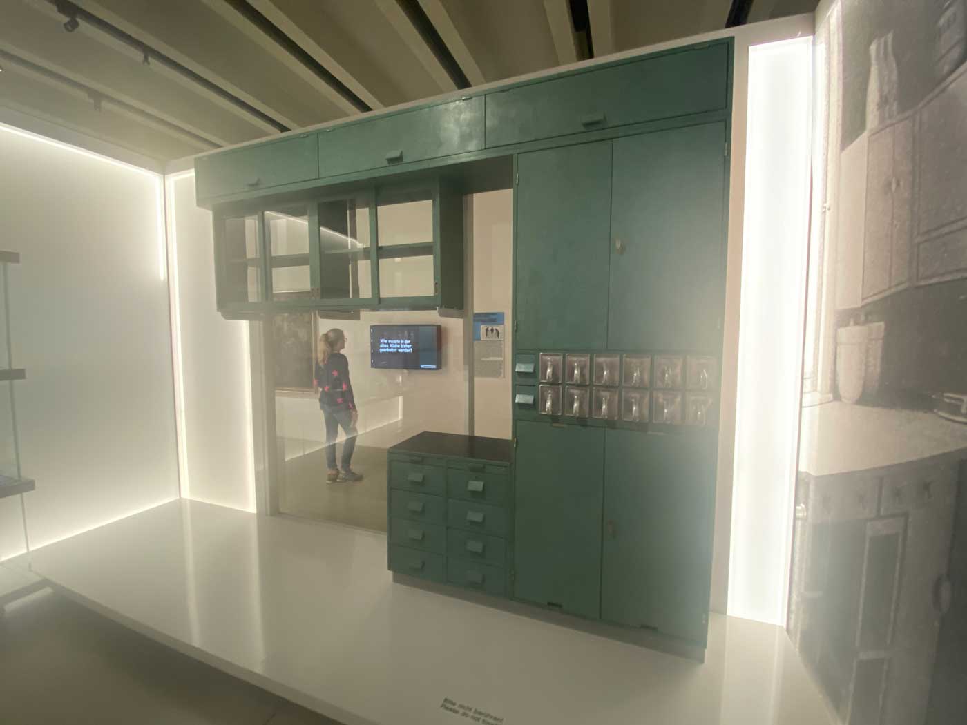 In Weimar staat ook nog een originele Bauhaus villa (Haus Am Horn). Voor deze villa is door de Bauhaus studenten een nieuw soort keuken ontworpen. Ook in andere Duitse steden was men hier mee bezig. In het museum zijn een groot aantal voorwerpen te zien die in 1927 ontworpen zijn als onderdeel van de “Frankfurter Küche”. De keuken was ontworpen om vooral praktisch te zijn. Hier zie je ook weer de moderne vormgeven zoals die nu nog steeds gebruikelijk is. De volgende twee foto’s laten de ontworpen gebruiksvoorwerpen voor de keuken zien en de keuken zelf.