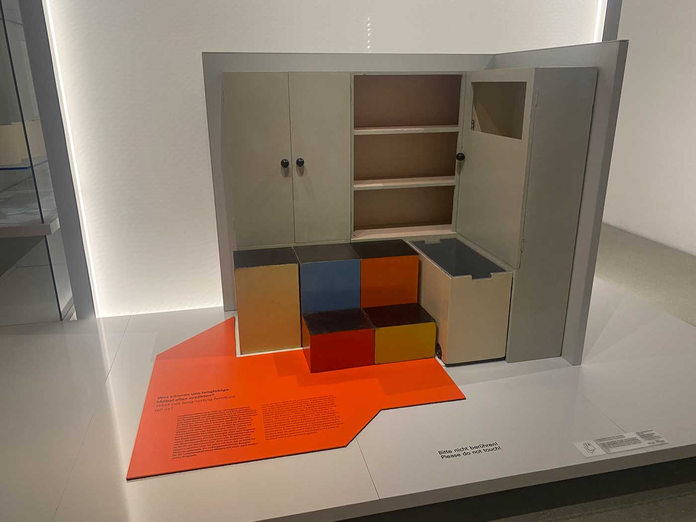 De volgende foto laat de speelgoedkast zien, die zich bevond in de kinderkamer van het Haus Am Horn. Deze is vanaf 1924 in kleine aantallen in serie geproduceerd. De kast die hier te zien is, is in 1934 door een Joodse familie meegenomen naar Engeland. Drie generaties lang is de kast in de familie gebleven om vervolgens in 2009 in het museum terecht te komen.