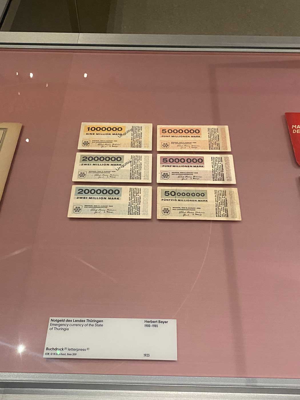 Een ander Bauhaus ontwerp is het noodgeld op de volgende foto uit 1923. Er heerste in Duitsland toen een grote inflatie. Hierdoor moesten met enige regelmaat nieuwe bankbiljetten gedrukt worden. Hieronder zijn biljetten uit de deelstaat Thüringen te zien met waarden van 1 tot en met 50 miljoen Mark.