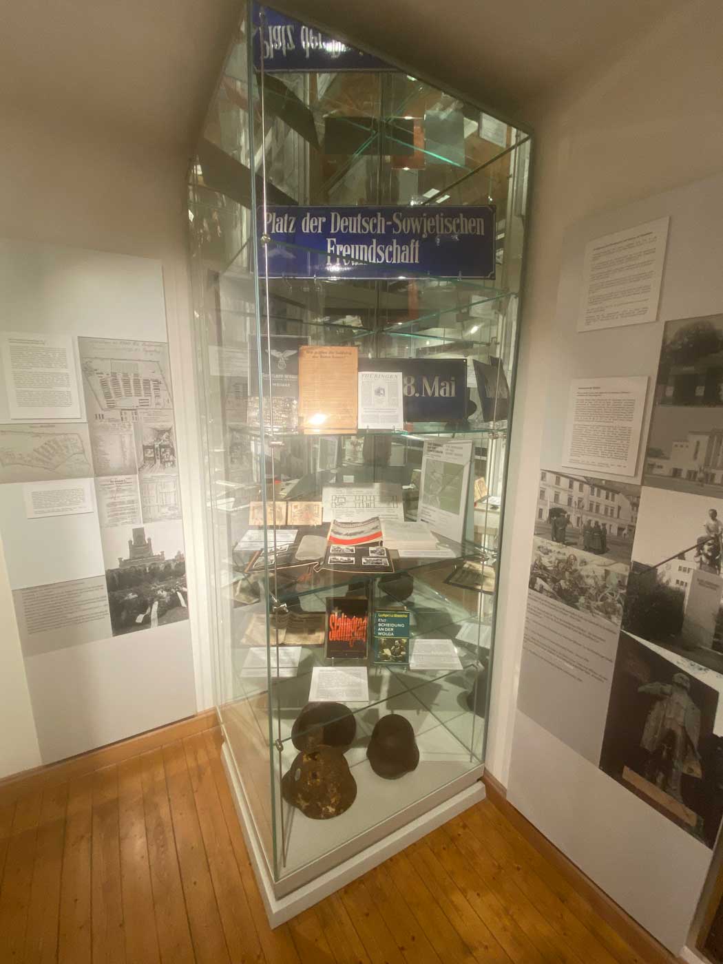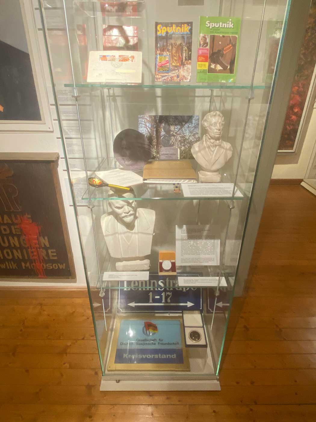 Op de volgende foto is een vitrine te zien met allerlei voorwerpen uit de DDR-tijd. Bovenin staan oude tijdschriften, in het midden een beeld van Lenin, onder in een straatnaambord van de Leninstraat en een schild van de DSF. Dit was de gemeenschap voor Duits-Sovjetische vriendschap. Deze organisatie informeerde de inwoners van de DDR over het leven in de Sovjet-Unie.