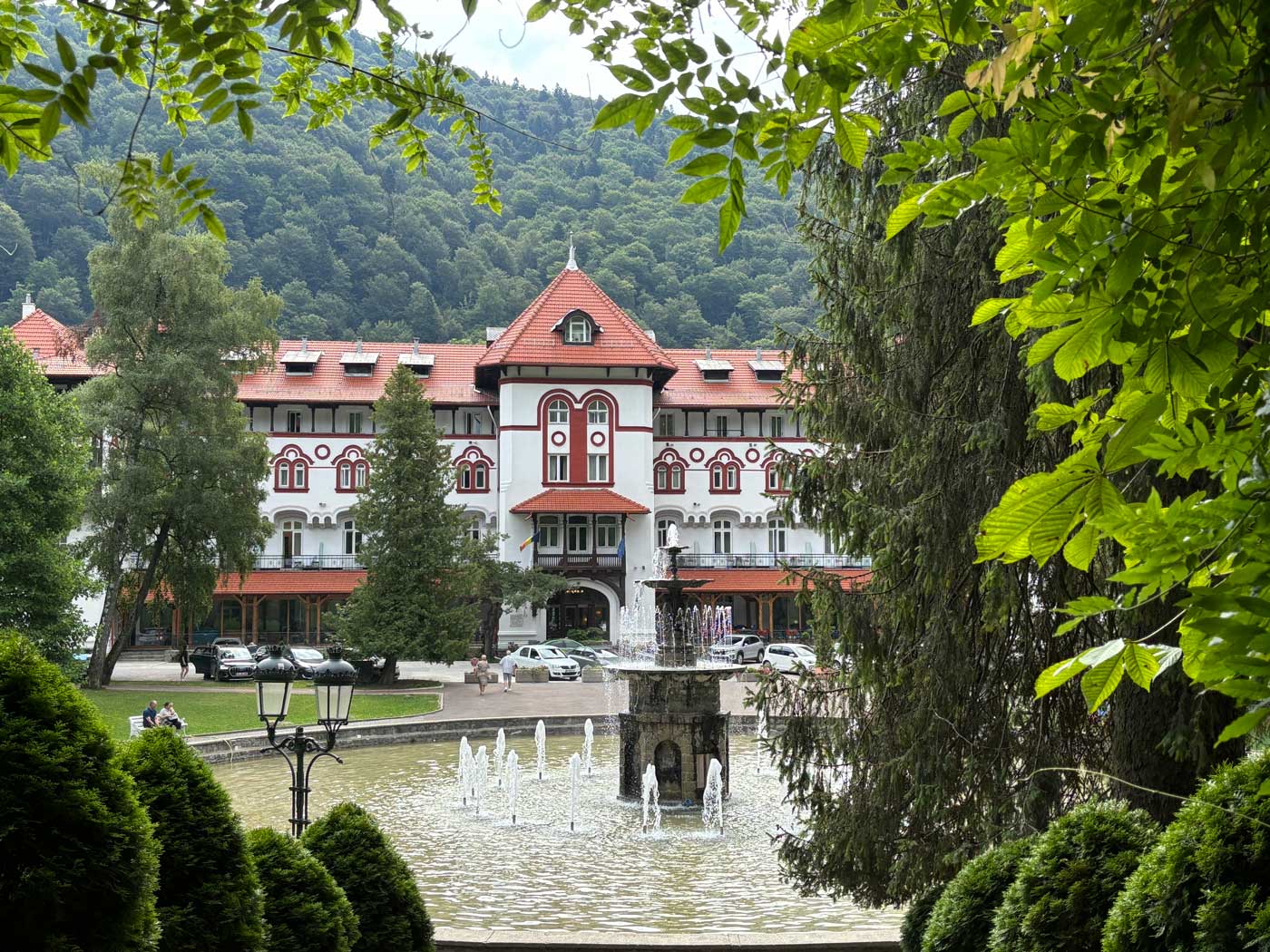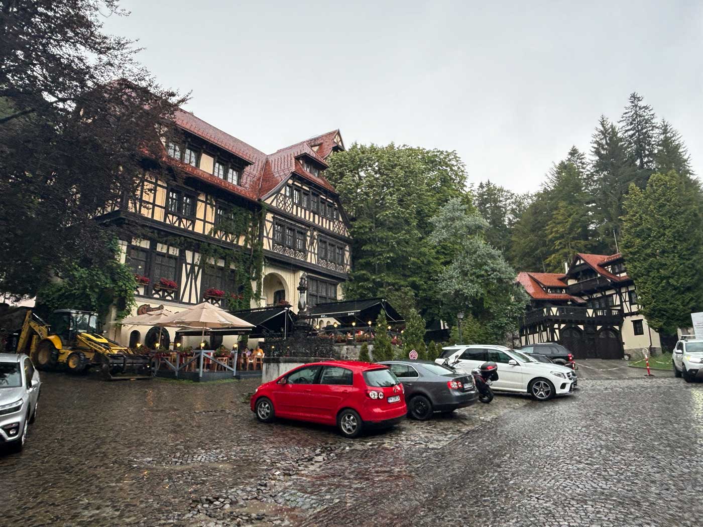 Nadat de ergste regen voorbij was, ben ik eerst wat gaan eten in een van de restaurants in de buurt om tegelijkertijd wat op te kunnen waren. Hier waren de Duitse invloeden van vroeger ook weer zichtbaar. De onderstaande foto zou zo maar ergens in Duitsland genomen kunnen zijn, maar het is toch echt Sinaia in Roemenië.