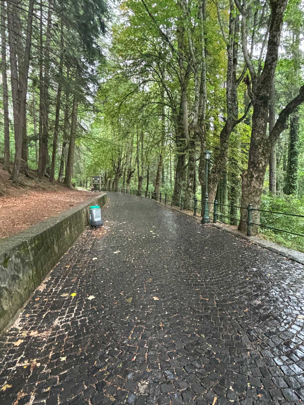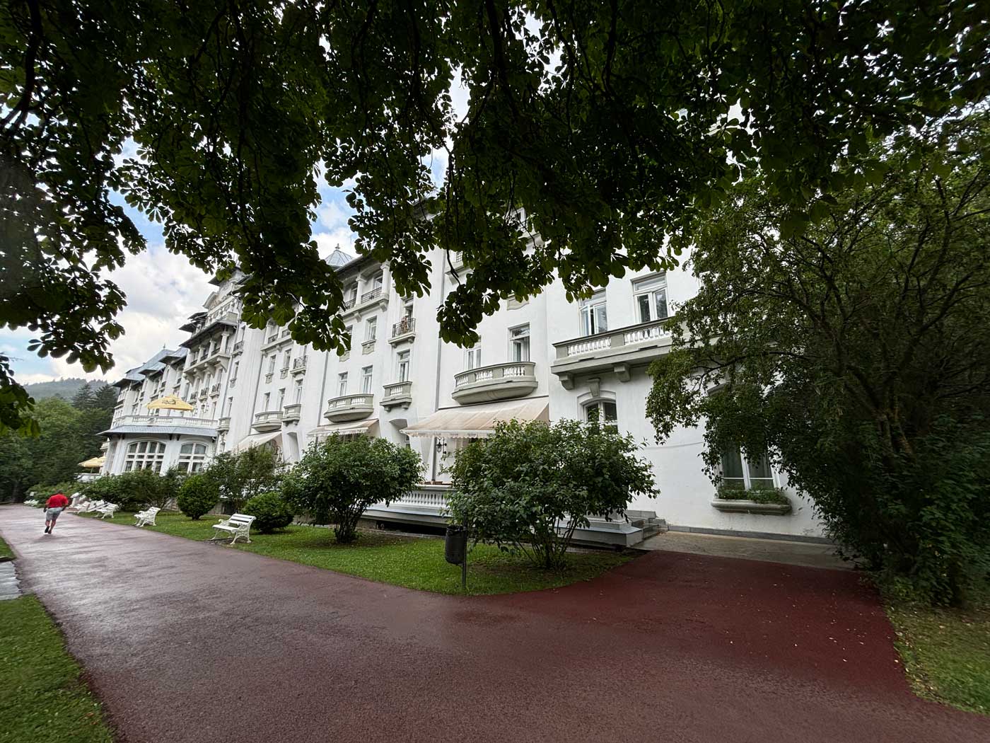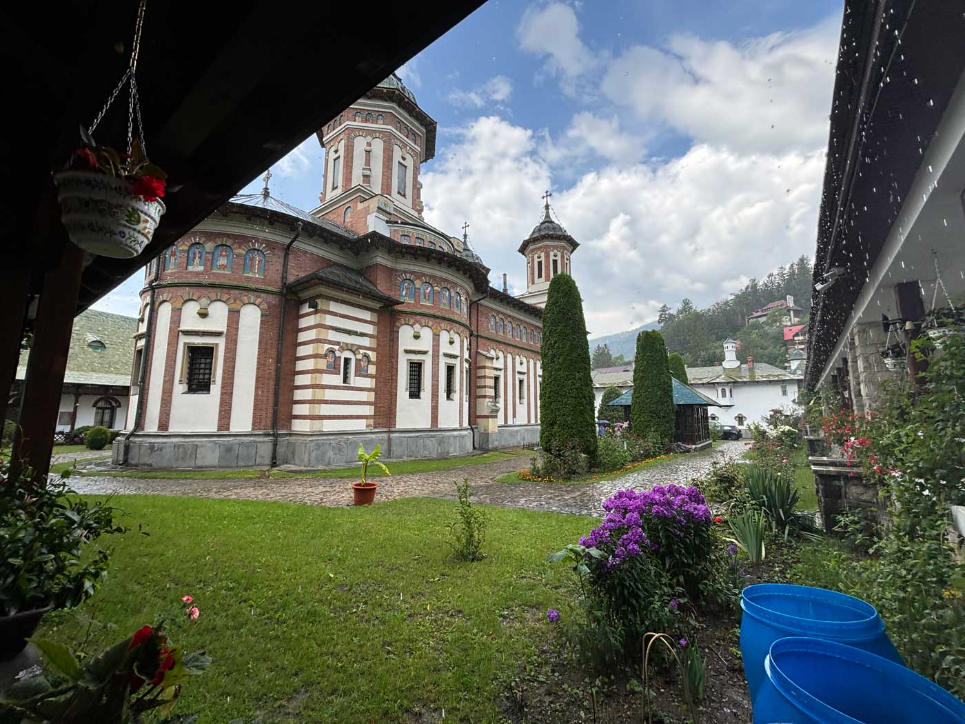 Vanuit het klooster loopt er vervolgens een wandelpad omhoog naar het Peles kasteel. Het weer was er inmiddels niet beter op geworden. Met enige regelmaat waren er regenbuien en de temperatuur was gezakt tot een graad of 20.