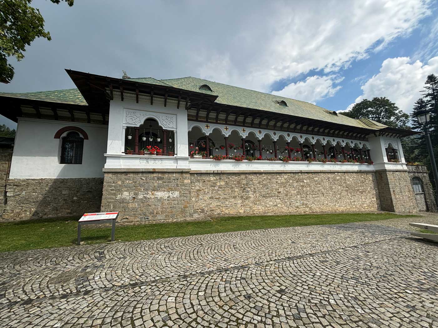 Het Sinaia klooster is in 1695 gesticht door prins Mihail Cantacuzino. De volgende foto is genomen vanaf de straat die langs het klooster loopt. Hierop kun je de grote kerk van het complex zien. Deze kerk is pas later (in 1846) gebouwd.