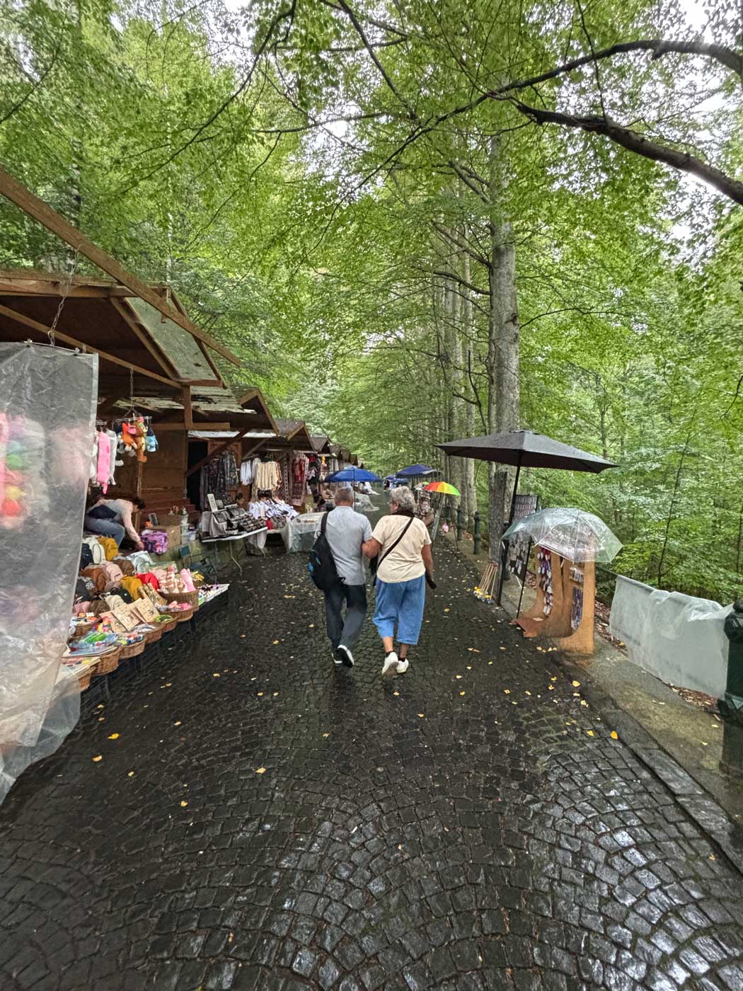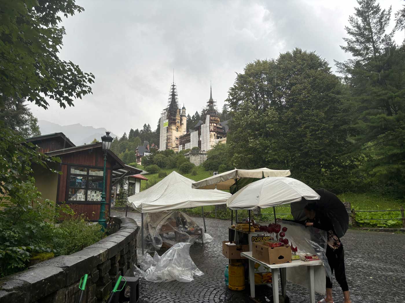 Toen ik bijna boven aan het wandelpad was, brak er een enorme regenbui uit en was het een kwestie van schuilen onder een van de vele schermen die bij de kraampjes stonden totdat het over was. Op de onderstaande foto is het Peles kasteel al te zien, dat in de zomer van 2024 aan de buitenkant flink verbouwd werd.
