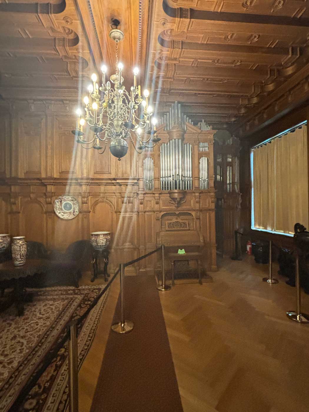 Even verderop is de kleine muziekhal. Net als in de grote muziekhal staat ook hier een orgel van het bedrijf Rieger. In een aantal vitrines die op de onderstaande foto niet te zien zijn, staan waardevolle voorwerpen (van onder andere porselein) uit het verre Oosten.