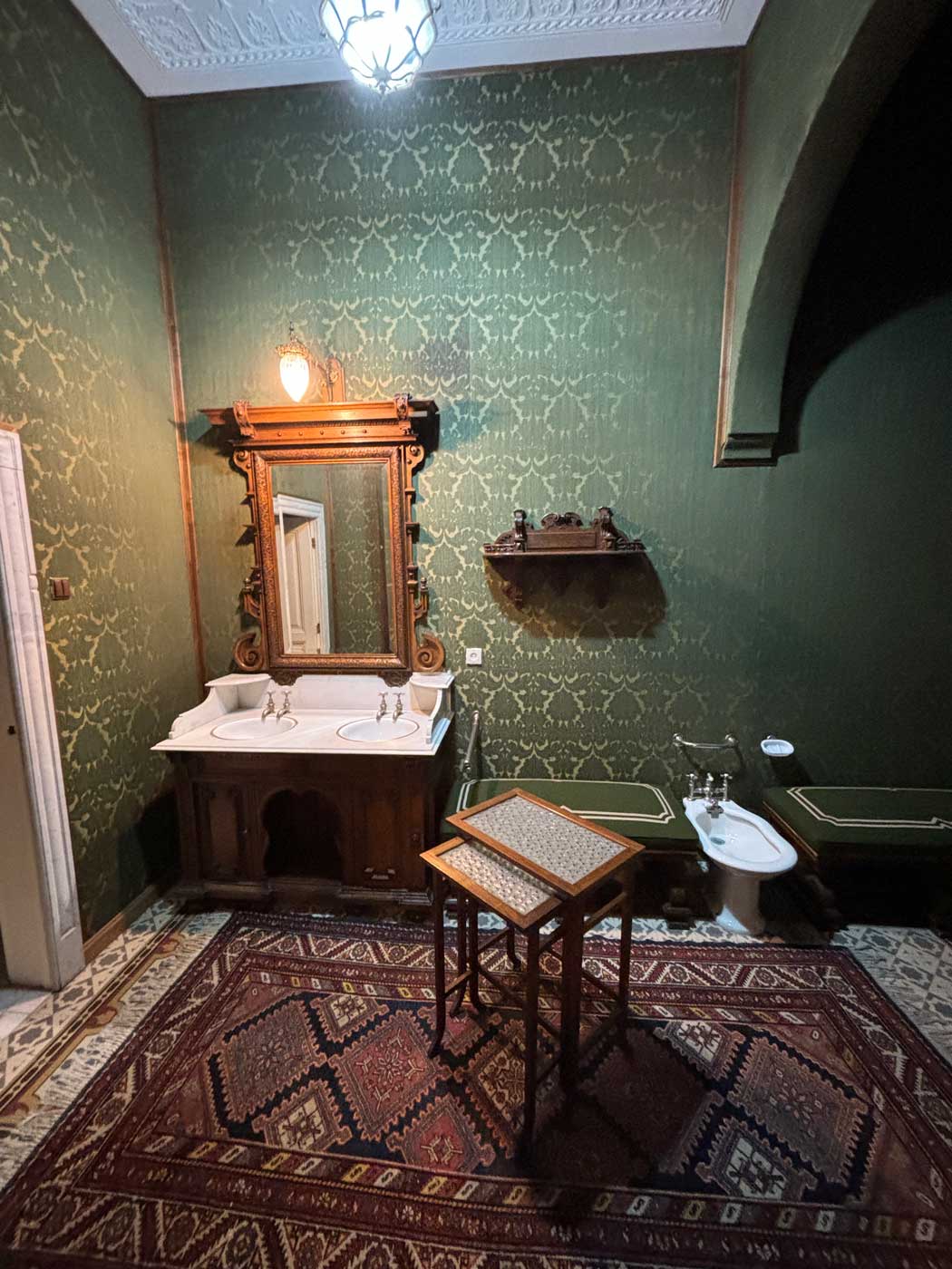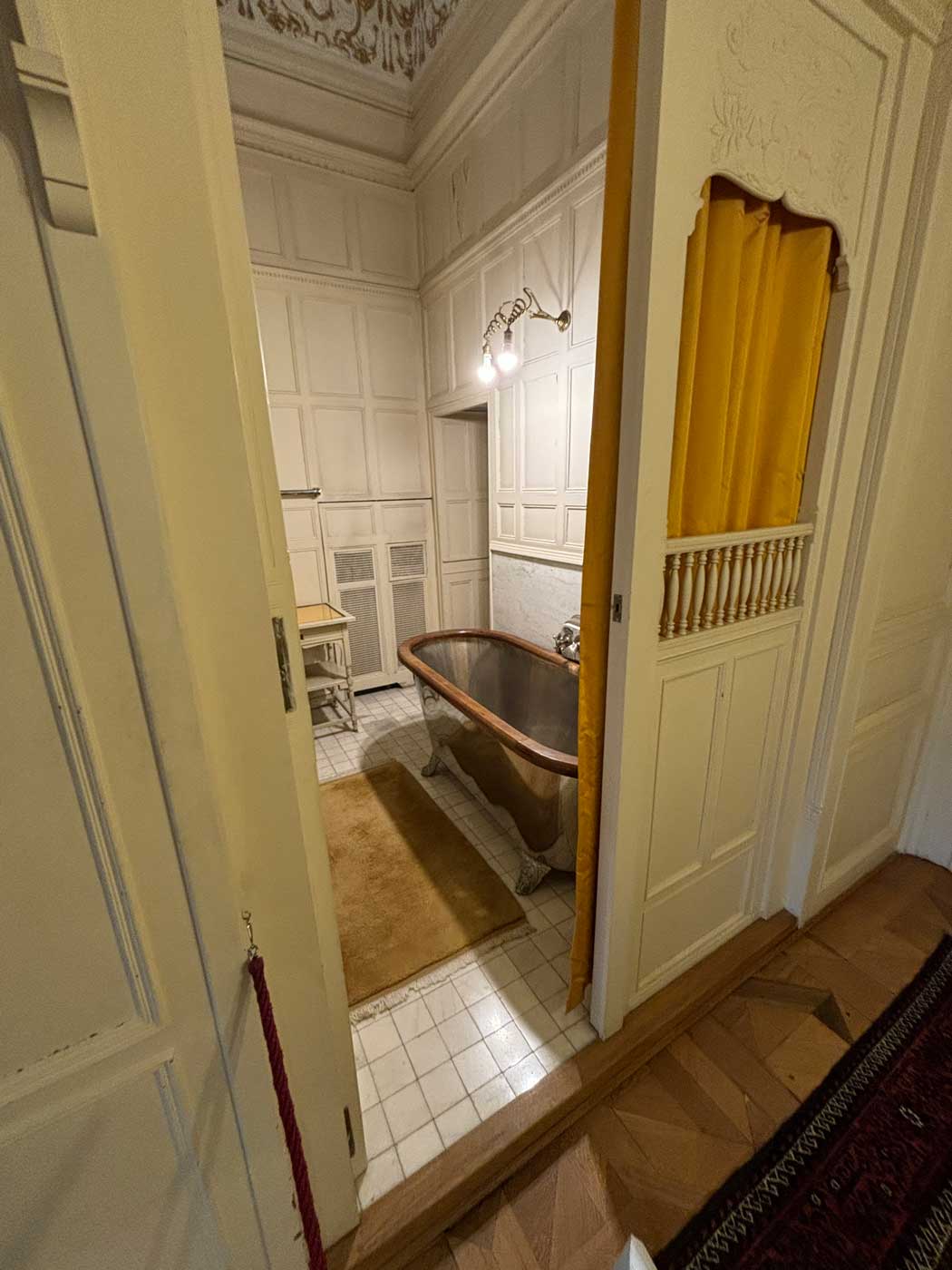 De luxe badkamer van het kasteel bestaat uit verschillende eikenhouten meubels. Er staan bronzen en messing vazen in oriëntaalse stijl. De zinken badkuip, die op de foto niet te zien is, net zoals de kranen voor koud en warm water en het toilet zijn nog in originele toestand.